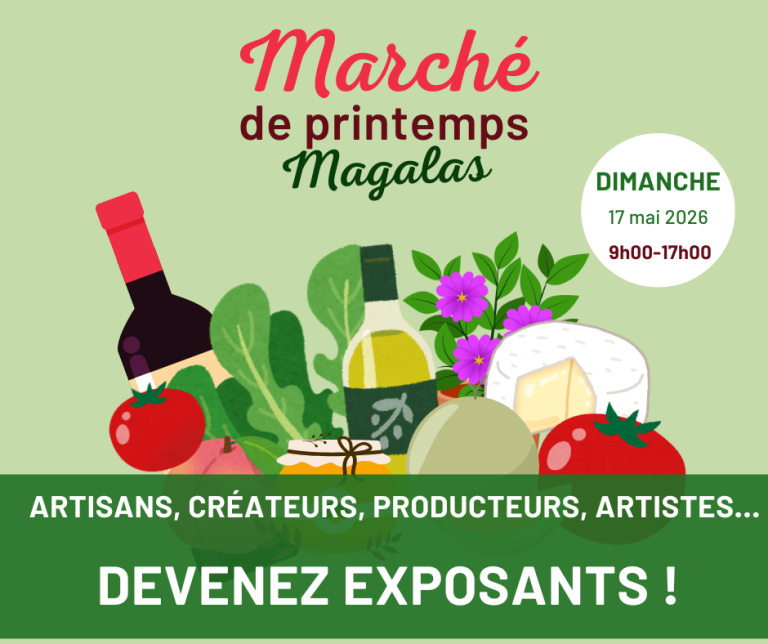 La commune lance un appel à candidatures pour son Marché de Printemps 🐞🌼 : artisans, producteurs, créateurs… venez partager votre savoir-faire et faire vivre le cœur du village ! » 👉 Informations & inscriptions : accueil2@ville-magalas.fr ou au 04 67 36 20 19