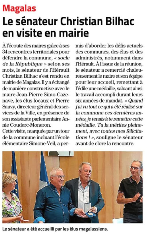Je suis ravi d’avoir été accueilli par Jean-Pierre Simo-Cazenave, Maire de Magalas, ainsi que par les élus municipaux. Cette rencontre a été l’occasion d’explorer les projets et les travaux réalisés dans cette charmante commune.